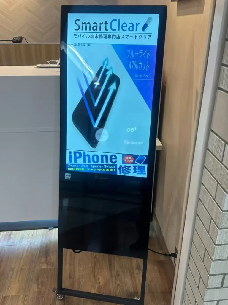 この度、「スマートクリア札幌駅地下アピア店」様よりご依頼いただき、社内にイーゼル型32インチ液晶タッチ機能付とスリムベゼルタイプ32インチ液晶×3台連結を導入させていただきました。札幌駅地下街に今年OPENしたばかりの新しいお店です。人の通りが多い為、圧倒的に認知度と集客が期待されます。ストアマネージャー様より集客が日に日に増えてると嬉しいお言葉を頂けました。