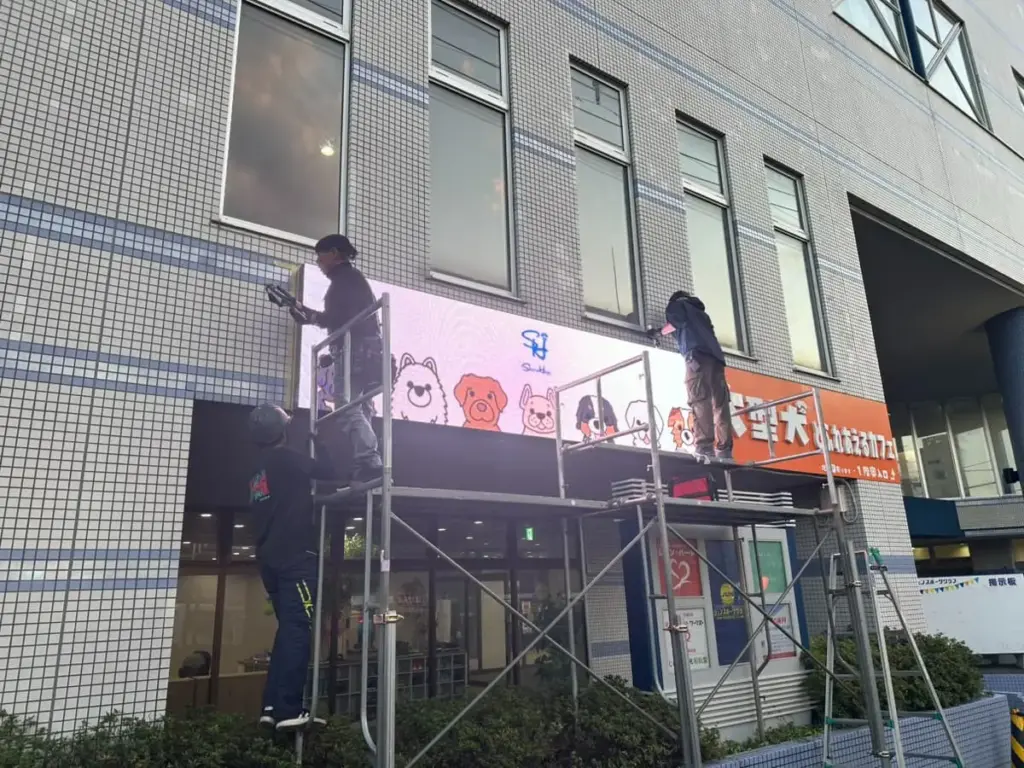北海道札幌市白石区にてTVでの反響も多かったあの「大型犬カフェ Share Hapi」様よりご依頼いただき、屋外用LEDビジョンを設置させていただきました。