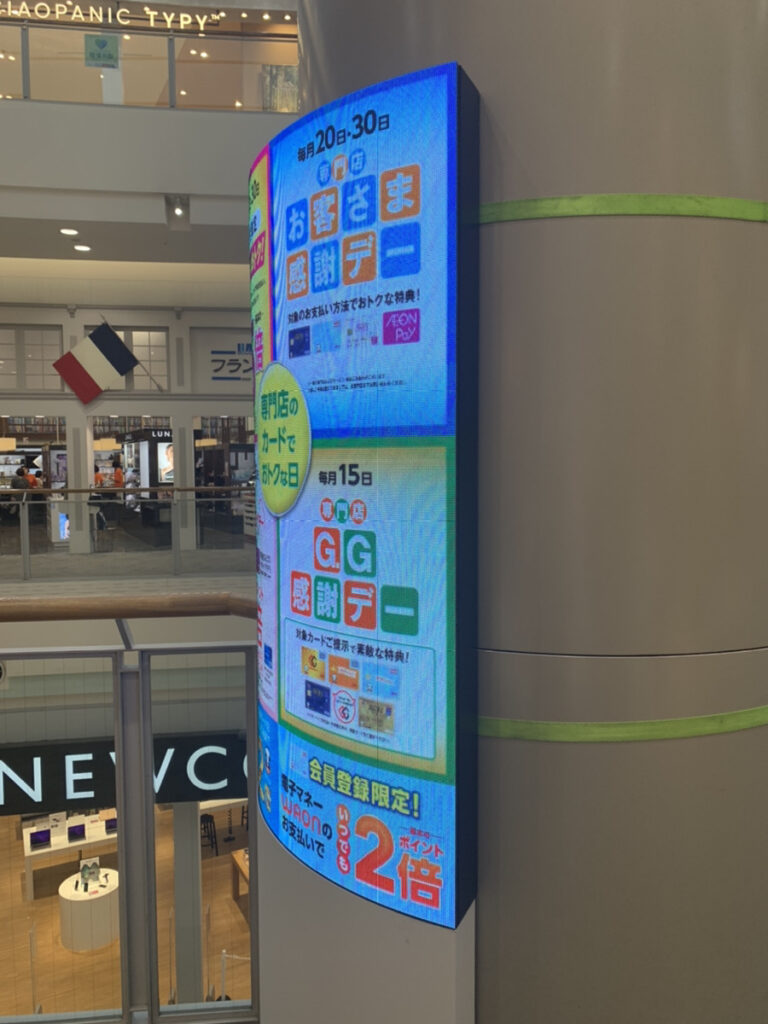 この度、広島県府中市にある「イオンモール広島府中 」様よりご依頼いただき、店舗内の看板としてフレキシブル型デジタルサイネージを導入させて頂きました。