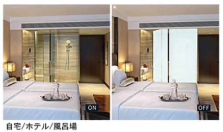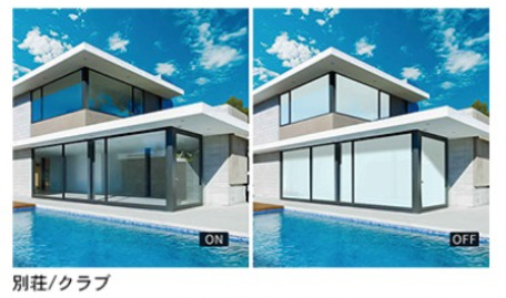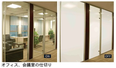 電気のON/OFFで、瞬時にフィルムを透明・不透明に切り替えることができ、オフィスの応接室や、会議室などあらゆるシーンで「スマートウィンドウ」としてご使用いただけます。