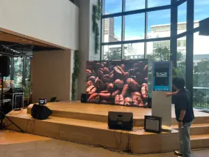 キューブ型サイネージは、パッと目を引くデザインが魅力で、PR効果が高いです。
