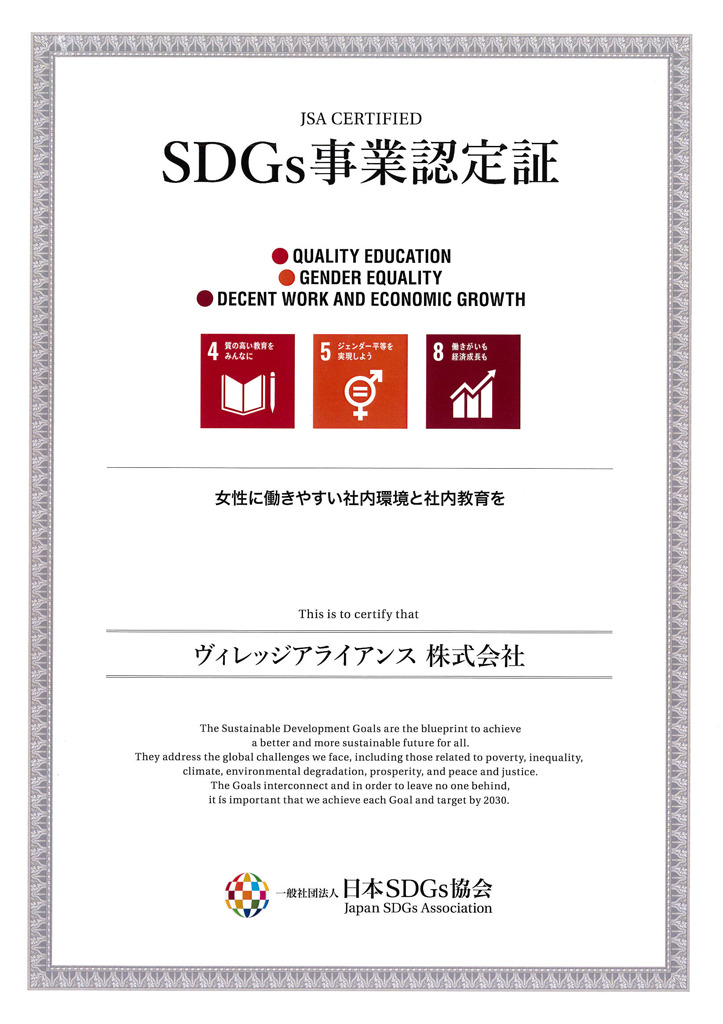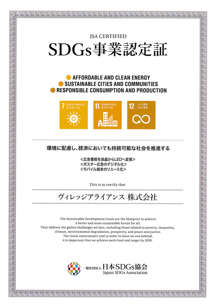 LEDUSVision(リデュースビジョン)の運営会社であるヴィレッジアライアンス株式会社は、SDGsの目標達成に向けた取り組みとして「SDGs事業者認定」を取得しました。